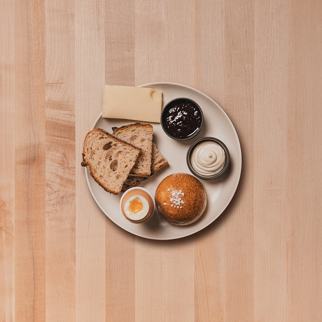 Surtido de panes (según la disponibilidad de día). Acompañada de un huevo a la copa y dos rebanadas de queso suizo, mantequilla y mermelada de frutos rojos