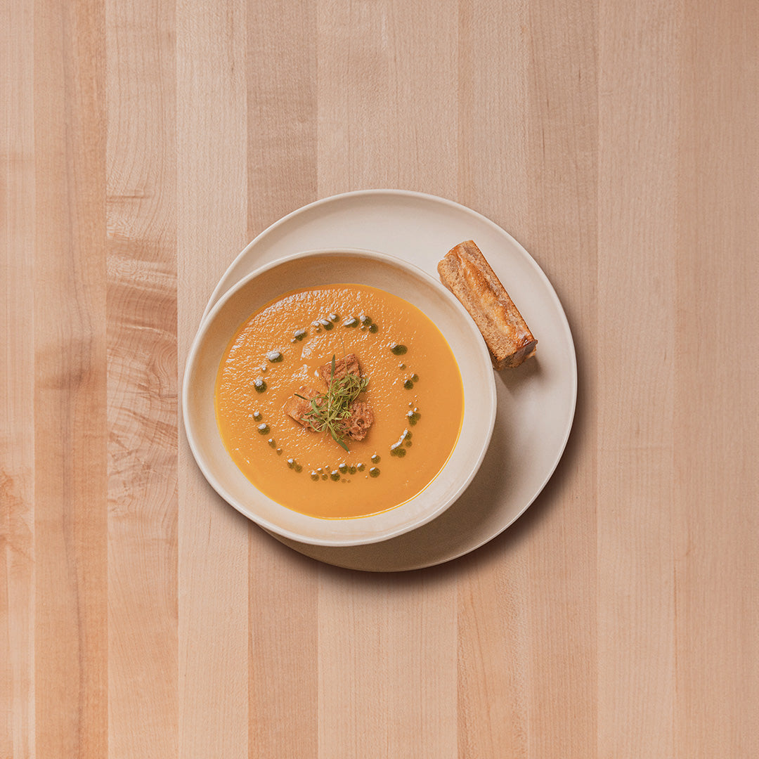 Sopa de zanahoria con leche de coco, jengibre y curry con brotes de zanahoria, acompañado de un grilled cheese de brioche clásico.