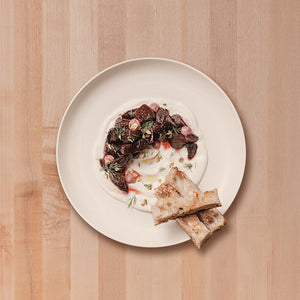 Remolachas rostizadas con miel orgánica, menta y albahaca fresca, sobre un untable de queso feta y queso cottage. Decorado con botones de pesto de remolacha, pistachos tostados, miel orgánica, ralladura de limón, aceite de oliva, y ramitas de eneldo. Acompañado de barritas de pan baguette orgánico.