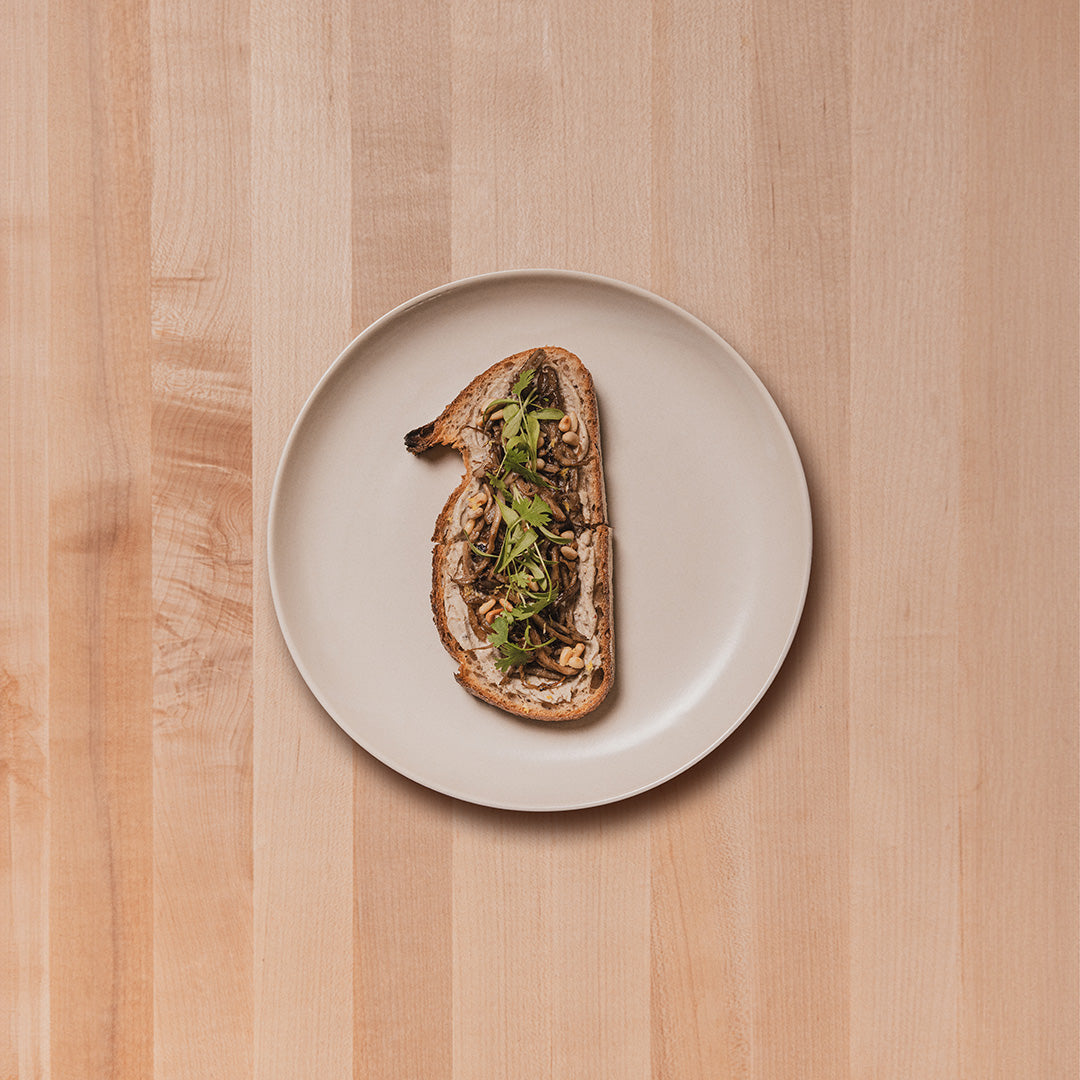 Hongos ostra salteados con chalota, jeréz y miel de miso. Sobre una base de queso pimienta rosada de Casa Planta, coronado con brotes de cilantro y piñones tostados con pan Country Loaf.
