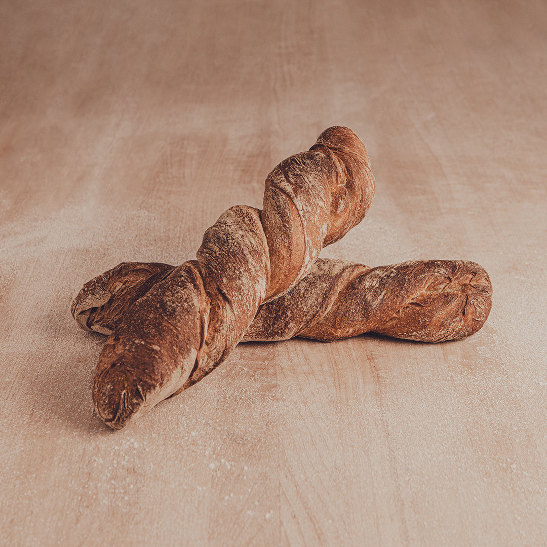 Conocido popularmente en Austria como Wurzelbrot, que significa raíz de árbol; de ahí su forma torcida que se hace a mano durante el proceso de amasado. Nuestra receta está hecha con un blend de harinas, entre ellas harina centeno Waldstaude, catalogado como uno de los mejores centenos del mundo, cultivado en un ciclo de dos años en las regiones boscosas de Waldviertel y Mühlviertel de Austria. Sus ingredientes lo hacen un pan robusto, con un sabor y color que lo diferencia de los baguettes tradicionales.