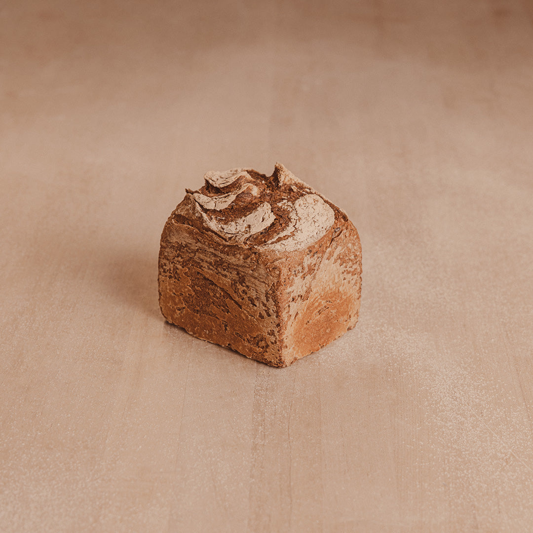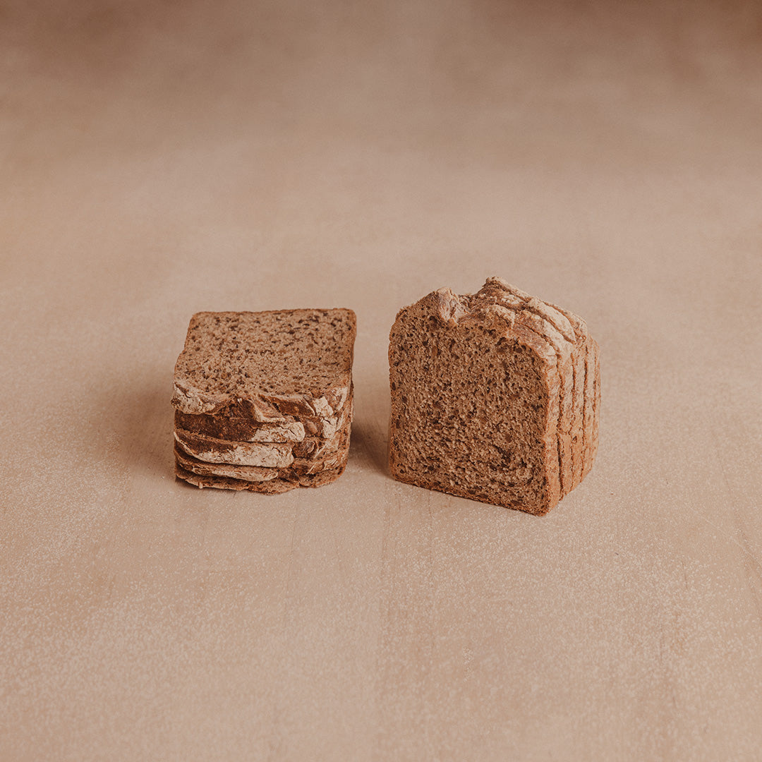 Pan de miga esponjosa y densa, elaborado únicamente con masa madre, proveniente de harina orgánica de centeno. Agregamos semillas de girasol para darle un perfil de sabor y nutrientes, luego lo horneamos en un molde cuadrado y así lograr una corteza delgada pero crujiente que le aporta estructura y carácter.