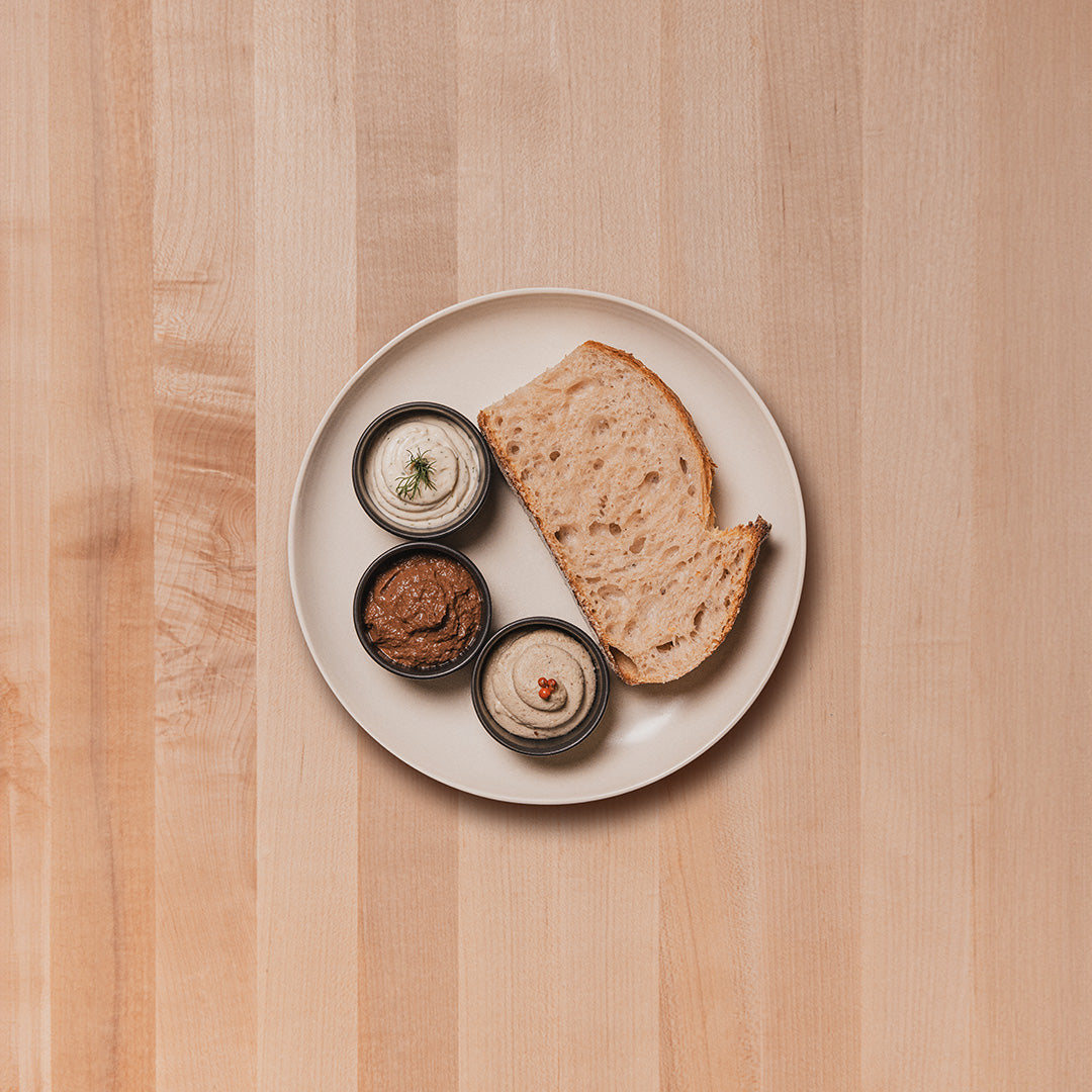 Tres rebanadas de Country Loaf orgánico, con spreads de: kalamatas con tomates, ajo con eneldo, queso de pimienta rosada de Casa Planta.