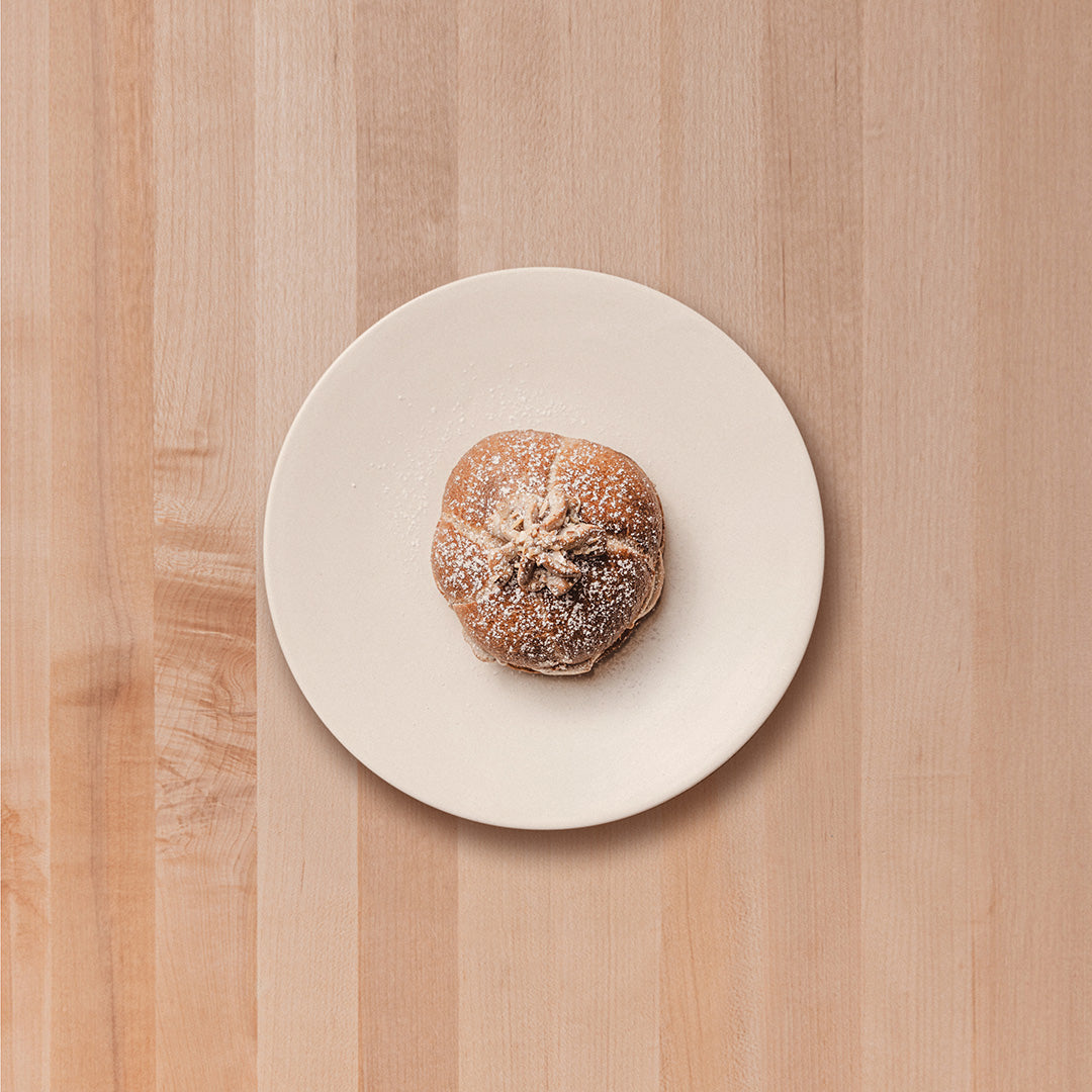 Brioche trenzado de masa madre con un untable de naranja y relleno de una crema -libre de lácteos- a base de almendras. Decorado con almendras rostizadas.