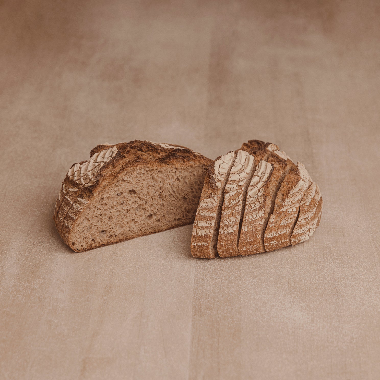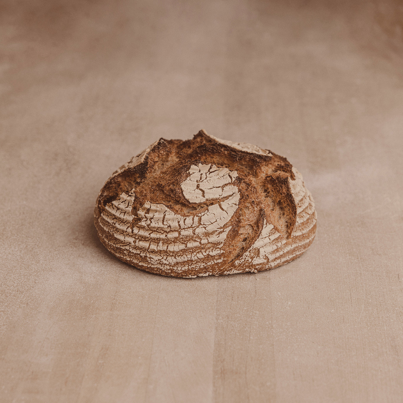 La harina integral es el ingrediente principal de esta receta, acompañada por el centeno como ingrediente secundario, que le da más carácter. A la harina integral se le llama de esta manera por su proceso de molienda, en el que se muelen el grano y la cáscara juntos, dando como resultado una especie de bálsamo natural que hace que la miga del pan sea húmeda y muy sedosa. Su apariencia rústica, es el resultado del “shaping” que se hace a mano antes de ser horneado.
