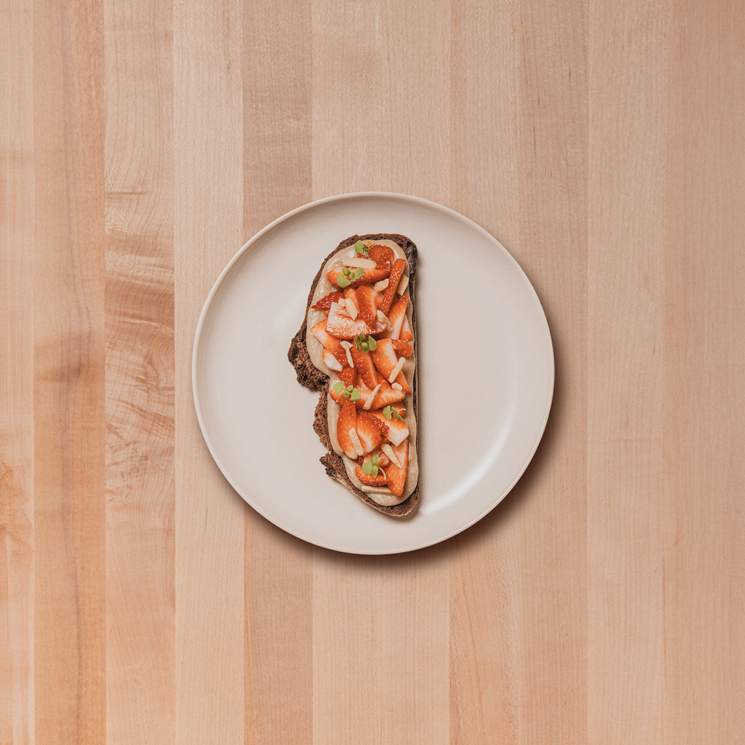 Untable de crema de pepitas de marañón, almendras confitadas y fresas frescas con brotes de albahaca sobre un pan chokobrot.