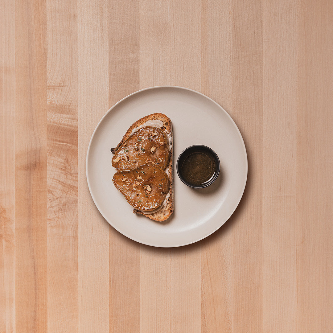 Peras rostizadas al horno sobre un untable de queso feta vegano, pecan tostadas, miel orgánica de Mamita's Honey y tomillo fresco.
